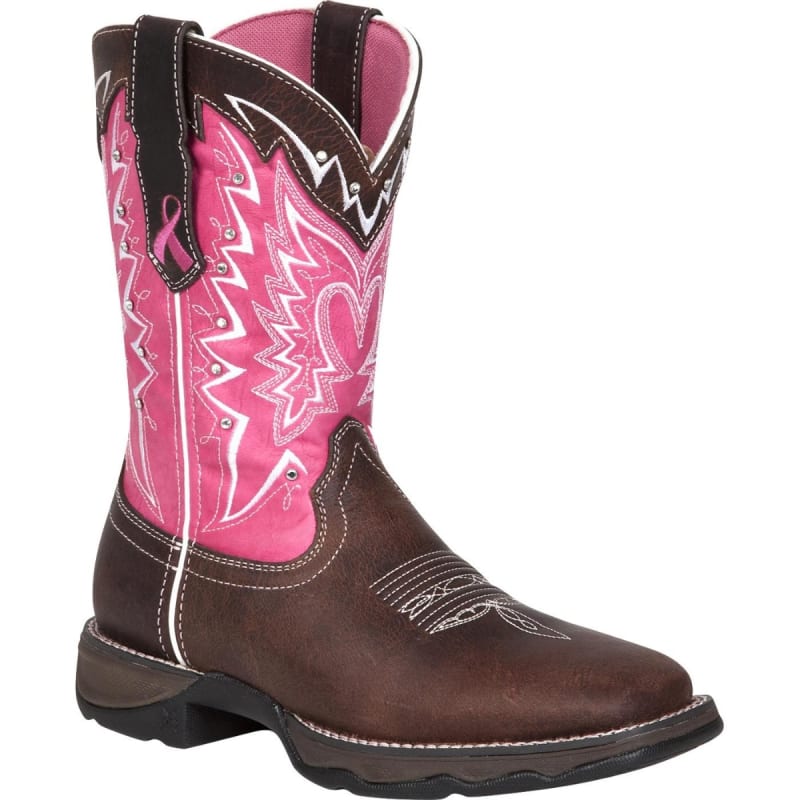Durango RD3557 only $148.95. Contoured, ventilated, removable cushion footbed Cushion Flex insole Dual-density, translucent rubber graphic outsole with molded EVA midsole Rocky Brands, Inc./Durango Boots will donate $10.00 for each pair Susan G. Komen/Durango Boots sold to the Susan G. Komen for the Cure. With a guaranteed minimum donation of $25,000. Distressed full-grain leather upper Double row welt stitch Rolled shank area Tempered Steel Shank The American Cancer Society reported that “An estimated 39,920 breast cancer deaths (39,510 women, 410 men) are expected in 2012.” By you wearing this #RD3557 Durango boot, you are able to show your support for those who have been affected and create awareness about this disease. The upper features full-grain brown leather; the shaft is adorned with embellishments, white stitching, and the eye catching hue reminds others that the color pink just might change the world. Each pull tab features a pink ribbon. Characteristically, once you have broken in your Western boots, the comfort level is so astounding that you have no interest in wearing anything else. Durango made these pull-on boots even more comfortable for your feet by adding a cushioned footbed. When you step down, you’ll receive cushioning and the ventilation helps supply airflow. While the tempered steel shank delivers stability and arch support, the molded EVA midsole provides cushioning to your steps. A pink ribbon graphic appears on the rubber outsole.