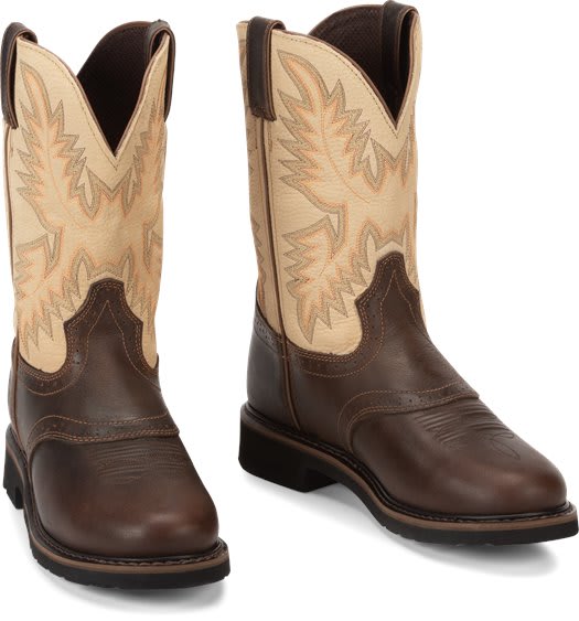 wk4660 justin only 127.95 free shipping. Both functional and stylish, the Superintendent Creme Soft Toe is an 11-inch tall Men's work boot has versatility. Its bone white leather upper is accented by a pastel yellow and green-toned stitch pattern. The golden brown perforated saddle vamp has a round toe and is slightly distressed giving this boot a vintage feel. The J-Flex Flexible Comfort System® insole adds cushion and support while the Stampede™ rubber and EVA combination outsolep provides resistance to abrasion, chips, slipping, and marking which allows you to comfortably work on any surface. Justin has changed the style number to SE4660 but is the same boot they have changed about 15% of the styles from WK to SE but both are the same